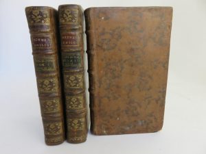 in-12, reliure d’époque en plein veau, dos à nerfs ornés, pièce de titre en maroquin rouge et vert pour la tomaison. Tranches rouges. Série complète assez propre avec de petits manques de cuir sur les coupes du tome III. Une galerie de vers parfaitement verticale traverse le tome I sans gêner la lecture. Vendu en l’état.