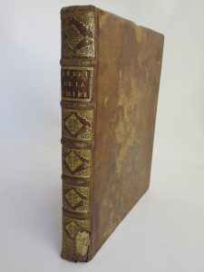 fleurons dorés, pièce de titre en basane marron, tranches mouchetées. Reliure correcte avec un petit manque de cuir en pied sur le dos, quelques épidermures sur le premier plat, usures d’usage, cuir à nourrir. Collationné et complet du texte 1 f.b.-12 ff nc. -385 pp.- 5 ff. nc. 1 f.b. Manque le plan dépliant de la ville de Pékin.