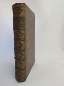 maniée mais solide, défauts en coins et en pied, manque la pièce de titre. Tampon humide, « bibliothèque André Laville ». 4 ff.n.c. dont frontispice et titre- 585 pp.- 27pp.n.c. (table) édition en langue Néerlandaise.. Exemplaire collationné et complet du texte, donc des 69 bois gravés dans le texte d’une demi-page chacun. L’exemplaire a été amputé de toutes ses planches hors-texte à l’exception d’une seule, double et montée sur onglet, intitulée : Arx Carolina. Il manque donc 55 planches hors-texte sur 56 qui sont : 7 portraits, 19 cartes doubles, 31 vues ou plans doubles. Deux feuillets sont presque détachés ; les feuillets de table ont été mal reliés et intervertis. Rare et très recherché. Vendu en l’état.