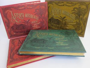 ont été restaurés : chaque plat, décoré avec titre doré et décor en noir, a été recollé sur la nouvelle percaline ; les gardes ont été renouvelées. Travail soigneux, reliure solide. La série se divise en 4 parties, soit 158 reproductions de photographies en noir et blanc et une carte, sans rousseurs, très rares piqures. Chaque photo mesure 15.5 x 11.5 cm. Intéressant témoignage du XIXème montrant les paysages mais surtout le mode de vie au Congo et au Zaïre. Texte de légende en Portugais. « Moraes est un des plus grands photographe portugais en 1882. Cunha Moraes publie un album avec des photographies de l'Afrique de l'Ouest. Entre 1885 et 1888, il publie 4 volumes intitulés West Africa : Album photographique et descriptif sous la responsabilité de David Corazzi, avec une préface de Luciano Cordeiro et des phototypes produits à la Casa Biel de Porto) Ces volumes constituent le premier travail phototypique réalisé à la Casa Biel. Les volumes sont divisés géographiquement, c'est-à-dire classés par zones du continent africain. Contient les 40 images, sauf le premier volume de 38 images, ce qui donne un total de 158 phototypes. Toutes les images ont été publiées, accompagnées de textes explicatifs » extrait d’un article publié sur le site : fotojornalismo. 13 en 2014. Bel ensemble complet et rare.