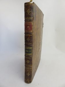 de titre en basane rouge, et basane verte pour la tomaison. Reliure solide avec quelques défauts d’usage dont un accroc sur la coiffe, et un manque de cuir et de carton sur la coupe du premier plat. Tome VI seul composant l’Atlas de la série qui comporte 5 volumes de texte. 124 planches réparties comme suit : 29 planches correspondant au tome I dont la grande carte de Russie (120 cm x 55cm) datée de 1787, 17 planches pour le tome II, 22 pour le tome III, 35 pour le tome IV et 21 pour le tome V. Toutes les planches sont en noir. Les sujets traités sont la botanique, l’ornithologie, l’architecture. Nombreuses cartes et plans.