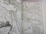 nombreux endroits ; coiffes coins et mors faibles et abimés. Manque de carton et de papier en haut du premier plat. Exemplaire collationné et complet des cartes. Contient :1 f.b.- titre gravé-avertissement-34 pp. 113 cartes montées sur onglet, contour des pays et frontières en couleurs d’époque. La table mentionne 111 cartes, toutes présentes ; 1 planche rajoutée (25 bis) intitulé « Royaume de la France » datée de 1793 et 1 planche 96 bis intitulée « Indes orientales » datée de 1754. Chaque carte mesure 77,5 x 51 cm. Quelques rousseurs et piqures éparses, deux ou trois déchirures et réparations et des mauvais plis. La plupart des cartes sont datées de 1750 ; les planches 109, 110 et 111 font partie du supplément de 1786 avec la Judée au temps de J.C., la presqu’ile des Indes, et surtout la carte des Etats-Unis d’Amérique datée de 1785. Atlas assez rare complet vendu en l’état.
