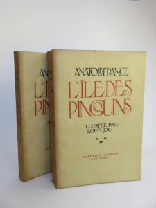 France Anatole - Jou Louis L’ile des pingouins. Paris, éditions Lapina, 1926. 2 volumes brochés petit in-folio, couvertures en vélin rempliées avec titre en noir et rouge. Quelques rousseurs éparses en particulier sur les tranches. Ouvrage...