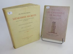 Les fables de la Fontaine illustrées par Oudry, reliées par Padeloup en plein maroquin rouge 1755/1759. « Histoire et chroniques d’Anjou » 1529. « Nouvelles relations de la Chine » 1690 en in-quarto. Illustrés modernes dont Mac Orlan : « Images secrètes de Paris » illustré par Assire avec une aquarelle originale, et aussi Bécat, Chimot, Lobel Riche, … « Les Maîtres de l’Affiche » en cartonnage éditeur, 1896/1900. Livres sur la Bretagne dont Mathurin Méheut, « Étude de la mer » et « Études d’animaux », coutumes de Bretagne du XVI siècle. Bel ensemble de livres érotiques illustrés par la photo etc. Nombreux livres vendus hors-catalogue, à la pièce et en lots, environs 200 cartons provenant de la bibliothèque de Mr. Charles DEDEYAN, né à Smyrne à la veille de première guerre mondiale. L’un des grands comparatistes du XXe siècle, professeur à la Sorbonne, directeur de l’U.F.R. de littérature comparée de Paris IV, internationalement reconnu dans les plus prestigieuses universités mondiales, nous dispersons à la fois l’outil de travail d’un chercheur et la collection d’un historien de la littérature et du livre, issu d’une longue lignée de collectionneurs et éditeurs Arméniens.