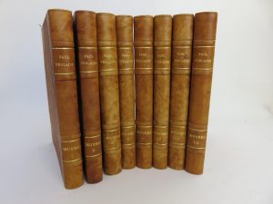 Verlaine Paul Œuvres complètes illustrées. Paris, Rombaldi, 1938. 8 volumes in-8°, demi-basane marbrée à coins, dos à nerfs avec auteur et tomaison dorés, têtes dorées, couvertures conservées. Propre, très rares piqures sur les tranches....