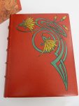 de feuilles vertes et fleurs jaunes, dos à nerfs avec auteur, titre et date dorés, toutes tranches dorées sur témoins. Contreplats mosaïqués dans le même thème, gardes moirées à motifs floraux, chemise en demi-maroquin orange à bande, l’ensemble sous étui de carton bordé de maroquin orange. Très belle reliure signée Charles Lanoë. Petit ex-libris de P. Brunet en cuir rouge collé sur le premier feuillet blanc. Couverture conservée. Ouvrage tiré à 210 ex. ; celui-ci du tirage de tête sur Japon ancien porte le n°9 ; signature de l’artiste sur le justificatif de tirage. L’exemplaire est en outre enrichi d’un dessin original couleur signé, suivi d’un second dessin original plus petit signé et avec un envoi : « A monsieur Paul Brunet, hommage de l’illustrateur au grand bibliophile » signé Henri Le Riche et daté du 1 juillet 1930. Rares piqures sur quelques feuillets. In-fine, l’exemplaire a été enrichi de 93 eaux-fortes sous forme de « suite » mais non justifiée, certaines gravures en simple tirage, la plus part en double et quelques unes en triple état sur différents papiers avec ou sans remarques. Le très beau travail d’illustration d’Henri le Riche est typique de cette période. Rare et bel exemplaire.