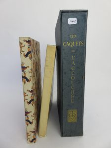 Hémard réalisées aux pochoirs. Exemplaire n° 408 sur 1450 imprimés sur pur chiffon. On joint 2 volumes du même illustrateur. Le premier : 1 volume broché in-4° : l’homme aux quarante écus, par Voltaire. A Paris chez Kieffer, 1925. Bon exemplaire, sans rousseur, n° 257 sur 480 exemplaires imprimés sur vélin. Le second : 1 volume in-4° en feuilles sous chemise et étui de l’éditeur : Les caquets de l’accouchée. Paris, la Tradition, 1941. Bon exemplaire, tirage total à 450 ex., celui-ci un des exemplaires sur vélin porte le n° 392. Rousseurs éparses. Soit 3 volumes.