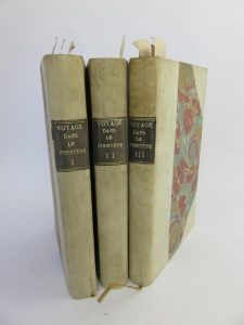 Cambry Jacques Voyage dans le Finistère, ou état de ce département en 1794 et 1795. A Paris, de l’imprimerie-librairie du cercle social, AN VII. 3 volumes in-8°, reliure postérieure (fin XIXème) en demi-vélin à coins, dos lisses avec pièce...