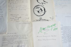 5 lettres dactylographiées signées par Chagall, relatives à une exposition de peintures à Monaco (18 mars 1978), remerciements dont une pour l’envoi de son livre sur Delacroix (1964 et 1985), situation du peintre russe Alexandre Gleser (20 mars 1976), félicitations pour l’obtention du prix Erasmus (30 juin 1966).