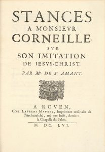 SAINT-AMANT - 1594 - 1661— STANCES À MONSIEUR CORNEILLE sur son Imitation de Jésus-Christ. — Rouen, Laurens Maurry, 1656. — In-4, maroquin rouge, double filet à froid, dos lisse portant le titre doré en long, tranches dorées (A. Lobstein).