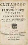 CORNEILLE 1606 - 1661 — CLITANDRE, ou l’Innocence délivrée, tragi-comédie. — Dédiée à Monseigneur le Duc de Longueville. — Paris, François Targa, 1632. — In-8, vélin souple de l’époque, boîte moderne.
