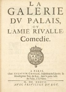 LA GALERIE DU PALAIS, ou l’Amie rivalle. — Comédie. — Paris, Augustin Courbé, 1637. — In-4, maroquin rouge, janséniste, dentelle intérieure, tranches dorées sur marbrure (Chambolle-Duru).