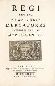 → Le dénuement de l’État amena en 1674 les marchands-merciers de Paris, l’une des plus riches corporations, à offrir au Roi une contribution spontanée de 50.000 livres. Mais à un Roi on ne fait pas l’aumône. Louis la leur retourna, le temps venu, avec un présent royal de 6.000 livres. Ainsi était le Roi. Les Gardes des marchands-merciers ne pouvaient faire moins que de célébrer ce bienfait et cette munificence. Ils appointèrent Santeul à cet effet et Corneille, qui sait le secret des vers bien frappés, s’employa à le traduire (M. Dubos, cat. Corneille, 1993, p. 52).
