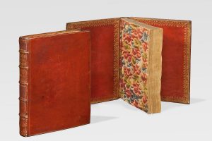 ♦ EXCEPTIONNEL EXEMPLAIRE, À GRANDES MARGES (H. 252 mm), DANS UNE ÉLÉGANTE RELIURE EN MAROQUIN DOUBLÉ DE L’ÉPOQUE. On remarquera la dentelle intérieure dorée aux petits fers et la jolie garde de papier marbré, strictement d’époque.