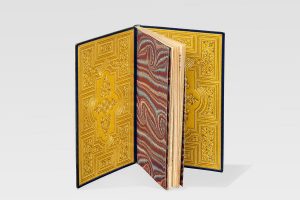 La reliure, exécutée par Joly fils, est parée d’une REMARQUABLE ET CHATOYANTE DOUBLURE DE MAROQUIN CITRON ORNÉE D’UN DÉCOR À COMPARTIMENTS DANS LE STYLE DU XVIIE SIÈCLE.