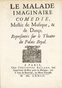 LE MALADE IMAGINAIRE, comédie, Meslée de Musique, & de Dançe. — Représentée sur le Theatre du Palais Royal. — Paris, Christophe Ballard, 1673. — In-4, bradel cartonnage (Reliure de la fin du XIXe siècle).
