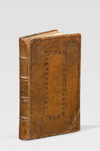 froid en encadrement, rectangle central de veau brun dessiné par un double filet et un filet festonné, avec fleuron aux angles, dos à nerfs portant le titre à froid en long dans un caisson (Reliure anglaise de l’époque).