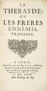 RACINE - 1639 - 1699 — LA THEBAYDE, ou les Frères ennemis. Tragédie. — Paris, Claude Barbin, 1664. — In-12, maroquin bordeaux, double filet à froid, nom de l’auteur en capitales dorées sur le premier plat, mention ÉDITION ORIGINALE sur...