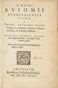 AUSONE. — Opera. — Anvers, Christophe Plantin, 1568. — In-16, veau granité, dos orné, tranches jaspées, dentelle intérieure (Reliure du XVIIe siècle).