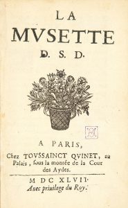 DALIBRAY (Charles Vion, sieur). — La Musette. — Paris, Toussainct Quinet, 1647. — In-12, maroquin rouge, triple filet doré, dos orné, dentelle intérieure, tranches dorées (Capé).