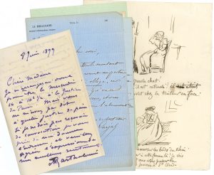 Albert Bartholomé (3 à Mme Marguerite Bernard, plus 3 cartes de visite autogr.), Étienne Carjat (8, 1870-1883), Cham (1 feuillet avec 2 dessins et légendes autogr.), Jean-Baptiste Daumier (vitrier et poète, père du peintre, 7 manuscrits autographes dont 6 poèmes, 1827 et s.d.), Félix Del Marle (1937 à Ph. Kah, sur son action pour l’art moderne dans le Nord depuis 1912), César Ducornet « né sans bras » (1854 à Déjazet), Carle Elschoët (2 à Clogenson, 1848-1852, sur ses statues), John Flaxman (1818), Gavarni, Émile Mascré (1839, au sujet de la gravure de son tableau de Louis XVII), J. Mitenne (XVIIe s., 2 dessins, modèles pour des sculptures), Abel de Pujol (1842 à Delsart, détail de ses peintures de la Chambre des Pairs).