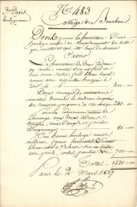 au comte Gaspard de Chabrol, préfet de la Seine ; 5 pages in-fol.Au sujet du remplacement de l’horloge du Collège Royal de Bourbon, actuel lycée Condorcet, et les devis fournis par l’horloger Bernard-Henry Wagner (1790-1851).