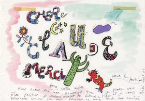 septembre 1986, à Mme Claude Pompidou ; 1 page oblong in-fol. d’un cahier à spirales (21 x 30 cm ; encadrée).Belle lettre ornée de décalcomanies, de collages et d’ornements aux encres de couleurs : mots coloriés, cactus, fleur, croisant de lune et étoiles, caméléon de fantaisie…« Chère Claude merci pour votre aide pour la fontaine. Nous avons eu une réunion que je pense vas être positive. Je serais bientôt de retour à Paris et je vous téléphone comme ça ont pouras ce voir »…