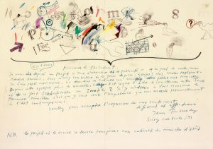 Soisy-sur-École (91) [vers 1965], à Georges Pompidou ; 1 page oblong in-fol. (29,5 x 42 cm ; encadrée).Très belle lettre illustrée d’un grand bandeau occupant toute la partie supérieure de la page, réalisé à l’encre, aux crayons de couleur, et aux tampons-encre, réunissant lettres, animaux et oiseaux, un cycliste, une clé mécanique, une serviette, des poulies, etc. Sous une grande accolade au crayon noir, Tinguely écrit au Président du Conseil : « Je vous aie déposé il y a 5-6 mois un projet “Tour d’attraction et de publicité” de la part de notre ami Maurice Rheims. Vous m’avez conseiller de le faire déposer (le projet) chez André Malraux. Je l’aie porté moi-même. Son directeur de cabinet m’a assuré parler aux Ministre. Depuis cette époque plus de nouvelles : est-ce que l’idée de construire cette tour et de ce fait irréalisable ou inutile ? Si je m’adresse à vous Monsieur le Premier Ministre c’est que je sait toute l’importance que vous accordé personnellement à l’Art contemporains »…