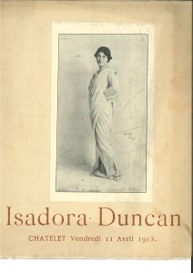 Programme illustré, Isadora Duncan, Châtelet Vendredi 11 Avril 1913 (La Belle Édition, 1913). in-4, couv. ill. d’une photo de la danseuse.Beau programme pour les danses et chœurs d’Iphigénie de Gluck, imprimé par François Bernouard, illustré par Albertine Bernouard, René Piot, Louis Sue, et en hors-texte par Antoine Bourdell, José Clara et Grandjouan ; textes d’Auguste Rodin, Joséphin Péladan, J. Paul-Boncour, Isadora Duncan, F. Komisarschewski, Eugène Carrière.