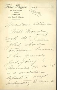 2 pages in-8 en-tête des Folies-Bergère ; en anglais.Des amis à elle devant quitter Paris pour les États-Unis quelques jours plus tard, elle souhaite leur consacrer tout son temps, et propose un rendez-vous le lundi suivant…