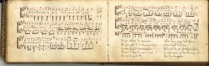 Manuscrit musical, Morceaux pour la Guitare, [début XIXe siècle] ; 53 ff. oblong in-12 (plus ff. blancs) plus titre et table, reliure de l’époque veau fauve avec ornements dorés ou à froid (frottée et usagée).Recueil joliment calligraphié de 52 chansons avec accompagnement de guitare : « Pour le plaisir et pour la gloire », « Fleuve du Tage », « Si tu m’aimais », « Tu reviens encore aimable printems », « Il est minuit », etc.