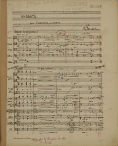14 pages in-fol. sous couverture titrée de papier brun (bords renforcés).Orchestration du deuxième mouvement du Quatuor à cordes. Cet Andante a été créé à la salle Cortot le 25 mai 1936 par l’orchestre de Jane Évrard, et publié par Heugel en 1950.Cette partition d’orchestre a été soigneusement établie à l’encre noire sur papier à 20 lignes de la Néocopie musicale ; Jolivet y a porté des remaniements sur des collettes : la page 6 a été entièrement refaite et collée sur la version primitive. Elle porte le cachet d’enregistrement à la SACEM le 13 février 1935. Elle a servi de conducteur en location (avec le cachet d’Heugel), et présente de nombreuses annotations de direction aux crayons bleu et rouge ; elle a également servi pour la gravure de l’édition.Sur la couverture, Jolivet a noté l’« effectif souhaitable » minimum et maximum : 5/14 premiers violons, 4/12 seconds violons, 4/10 altos, 3/8 cellos, 2/6 contrebasses.Discographie : Orchestre du Théâtre des Champs-Élysées, dir. Ernest Bour (1955, EMI 2004)