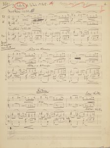 30 pages in-fol. Intéressant manuscrit sur la genèse de cette Petite Suite tirée d’un projet de musique de scène, reprenant l’effectif de Claude Debussy pour sa Sonate en trio pour flûte, alto et harpe (1915).André Jolivet a réutilisé une partie de la musique de scène écrite en 1941 pour une adaptation libre de la pièce de Lope de Vega, Aimer sans savoir qui, que devait mettre en scène Jean Vilar. La Petite Suite comprend cinq brefs mouvements : I. Prélude ; II. Modéré ; III. Vivement ; IV. Allant ; V. Final. L’œuvre fut créée à Radio Paris le 13 novembre 1943, par trois membres du Quintette Pierre Jamet : Gaston Crunelle, Georges Blanpain, Pierre Jamet ; elle sera éditée posthumément en 1983 aux Éditions Musicales Transatlantiques. André Jolivet a ainsi décrit son œuvre : « Le Prélude accompagne la rêverie d’une jeune fille sentimentale se balançant dans un hamac par une voluptueuse soirée de printemps. Le Modéré développe l’impression de plein air dégagé par le prélude. Vif mêle des rythmes espagnols aux fuites des doubles croches suggérant le jeu des poursuites d’un jeune couple amoureux. Allant voit se dérouler un tendre dialogue et en exprime toute l’aimable douceur, tandis que par opposition, le Final expose le point de vue ironique et burlesque du traditionnel valet de comédie amusé de toutes ces aventures sentimentales. » Le manuscrit reprend des éléments du manuscrit de la musique de scène, à l’encre noire sur papier à 24 lignes, avec des ratures et corrections, et des annotations au crayon, et les numéros des mouvements au crayon rouge. Le Prélude est celui de l’acte I (3 p.) ; le Modéré reprend le n° XIII après la réplique du Flic : « Et laissons le jouvenceau tout seul » (4 p.) ; Vivement est le n° IV après la réplique d’Inès : « J’irai seule » (6 p.) ; Allant est le Prélude de l’acte III (6 p.) ; le Final est entièrement refait sur papier à 18 lignes à partir du Final de l’acte I et de l’Interlude qui le suit (11 p.).On joint une copie manuscrite de la musique de scène (60 p.), annotée par Jolivet, avec un ajout autographe de 4 pages (cachets de la SACEM du 30 novembre 1943) ; plus 3 feuillets de plans de réutilisation des morceaux, et minutage. Discographie : Pierre-André Valade, Miguel Da Silva, Frédérique Cambreling (Accord, 2002).