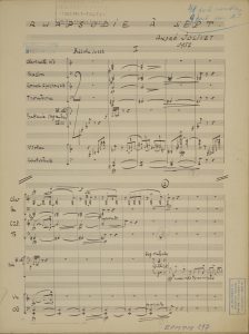 61 pages in-fol. sous chemise-titre. Manuscrit de cette belle Rhapsodie à sept, destinée à être jouée en même temps que l’Histoire du soldat de Stravinski, dont elle reprend l’effectif instrumental : clarinette, basson, cornet à pistons, trombone, violon, contrebasse, et une batterie très développée (cymbale suspendue, cymbale charleston, tam-tam, tambour de basque, petite et grande caisse claire, tambour militaire, grosse caisse, triangle, wood-block, 3 blocs chinois, cloche de vache, grelots). Le terme de rhapsodie renvoie, selon Jolivet, à « l’apparente liberté des lignes confiées à chaque instrument ». Elle comprend trois mouvements : I. Résolu ; II. Hiératique ; III. Incisif. L’œuvre fut créée en Allemagne au Festival de Braunschweig, le 13 novembre 1959, sous la direction de Heinz Zeebe. Le manuscrit est soigneusement noté à l’encre noire sur papier Durand à 24 lignes. Daté en fin « 24.X.57 », il porte les cachets d’enregistrement à la SACEM le 13 décembre 1957. Des annotations au crayon rouge montrent qu’il a servi de conducteur. Il a également servi à la gravure de la partition publiée aux éditions Pathé Marconi en 1959 (tampons du graveur Pierre Marcel et des éditions). Au dos du titre, Jolivet a dressé la nomenclature des instruments et leur disposition, ainsi que le minutage (environ 19 minutes). Discographie : Les Solistes de Marseille, dir. Devy Erlih (Lyrinx, 2005)