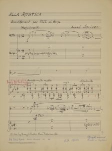 André JOLIVET. Deux manuscrits musicaux autographes, un signé, Alla rustica, Divertissement pour flûte et harpe [K 240], [1963]