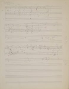 18 feuillets in-fol., et 18 pages in-fol. Brouillon complet et manuscrit définitif (incomplet) de cette œuvre pour orgue, commande de la fondation Schnitgerprijs Zwolle pour l’orgue historique de Zwolle en Hollande. Jolivet a construit cette pièce selon le principe concentrique du mandala de la cosmogonie indienne, comme il l’a expliqué : « Un des schémas cosmologiques reproduits dans des mandala est le jambu qui, d’après la cosmogonie de l’Inde, est une masse circulaire au centre de la surface terrestre, entourée par sept continents séparés par autant de mers. Au centre de cette “île” (Jambudripa) s’élève le meru, montagne inaccessible autour de laquelle tournent les constellations et qui contient le paradis d’Indra. […] La forme de l’œuvre se réfère au schéma jambu. Après une brève mutation ouvrante sont exposées sept séquences représentant les continents. Elles sont de complexité croissante tandis que les sept séquences figurant les mers (qui s’intercalent entre les continents) laissent décroître leur agitation initiale. Cette imbrication d’allures aboutit logiquement à la sérénité hiératique du meru. Dans une telle œuvre le symbolisme da la forme compte plus encore que les rapports entre les signes graphiques : les notes ne sont ici qu’une substructure des sonorités produites par l’orgue ». L’œuvre a été créée quasi simultanément le 8 juin 1969 au Festival Sigma de Bordeaux par Jean Guillou (qui aida Jolivet pour la registration) et le 18 juin au Festival de Zwolle par Charles de Wolff, et publiée chez Billaudot en 1970. Brouillon au crayon sur papier à 14 lignes, paginé 1-22 (plus 3 ff. bis et ter) plus 1 et 2 pour la Coda, avec des esquisses biffées au dos de 7 feuillets ; plus 1 feuillets d’esquisses biffé. Manuscrit définitif à l’encre de Chine sur calque, paginé 2-19 (une note de Jolivet indique qu’il a fait cadeau de la p. 1). On joint : – un tirage d’après le calque (cahier de 19 p.), avec corrections et annotations de registration au crayon noir, et cachets d’enregistrement à la SACEM le 7 juin 1969 ; – 12 ff. de notes autographes sur le mandala, le déroulement de l’œuvre et son minutage ; – lettres adressées à Jolivet par le Dr M. Van Deth de la fondation Schnitgerprijs Zwolle (8) sur la commande de l’œuvre et la venue de Jolivet à Zwolle (avec un programme et la photographie de l’orgue), et par J. Mettra, conseiller culturel de l’Ambassade de France à Amsterdam. Discographie : Jean Guillou (1971, Philips 1995).
