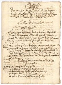 Compositeur, surintendant de la Musique de Louis XIV, créateur de l’opéra français]. Manuscrit, Ballet des Muses dansé par Sa Majesté a son chasteau de St Germain en Laye le 2e décembre 1666 ; petit cahier de 23 pages in-8.Manuscrit d’époque du livret du Ballet des Muses, conforme à l’édition de Robert Ballard en 1666. Le manuscrit reproduit le texte complet de l’« Argument » et du « Dialogue de Mnemosine et des Muses » liminaire, et les sommaires, listes des personnages et distributions des rôles des 13 « entrées » qui suivent, ainsi que les chants de la 4e entrée, mais sans le texte de la Pastorale comique de Molière incluse dans la 3e entrée, ni celui de la « petite comédie » Les Poètes dans la 6e. Le manuscrit ne comprend pas la 14e entrée (imprimée dans le livret) et s’arrête après la « xiiie et derniere Entrée ». Parmi ceux qui « dansent au ballet » figurent Mme de Montespan et Mlle de La Vallière (bergères), Lully (Orphée), et Louis XIV (Cyrus)… Suivent les Vers sur la personne et le personnage de ceux qui dansent au ballet, recueillis les Œuvres d’Isaac de Bensérade (Paris, Charles de Sercy, 1697, p. 357-377), c’est-à-dire les chants des 13 entrées du « Ballet royal des Muses ». Citons le quatrain de la 3e entrée célébrant Molière (« Le celebre Moliere est dans un grand esclat »…) et le huitain de la 7e entrée célébrant Lully : « Cet Orphée a le goust tres delicat et fin, / C’est l’ornement du siecle »…
