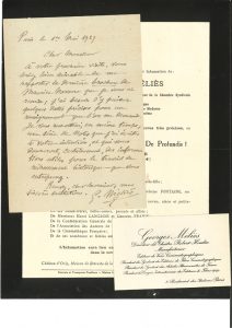 L.A.S., Paris 1er mai 1929, [à Claude Autant-Lara] ; 1 page in-8.Il le prie de lui rapporter « la dernière brochure de Maurice Noverre que je vous ai remise » ; il lui donnera en même temps « une série de notes que j’ai écrites à votre intention, et qui vous donneront, certainement, des informations très utiles pour le travail de redressement historique que vous entreprenez »… On joint sa carte de visite et son faire-part de décès