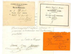 Compte rendu au Directoire exécutif par les Cns Francœur, De Nesle et Baco, sur le Théâtre de la République et des Arts, avec lettre d’envoi signée par ces administrateurs (1798). L.S. d’Antoine Fourcroy, conseiller d’État à l’Instruction publique, au directeur de l’Opéra, pour augmenter le traitement de Laÿs (1802). Avis par le Grand Maréchal du Palais d’une décision de l’Empereur pour la livrée du Suisse de l’Opéra (17 mai)... Lettres de Léon Pillet à Nestor Roqueplan concernant l’hostilité du Figaro (1832), et à un rédacteur, sur son procès avec Spontini (1840). Académie royale de Musique, Compte rendu de la Gestion, depuis le 1er juin 1840 jusqu’au 1er juin 1846. L.a.s. d’Olivier Halanzier concernant une artiste dans le besoin (1886). On joint 3 billets de l’Académie Royale de Musique pour des loges (une pour Taglioni), dont un signé par le duc de Choiseul.