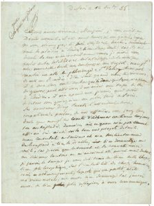 2 L.A.S., Paris 12 décembre 1785 et 16 janvier 1786, à John de Bossey, à Londres ; 2 pages et demie in-4 chaque, adresses. Intéressantes lettres de jeunesse. John de Bossey, fils de famille dépensier, réfugié à Londres, habite chez le père de Talma, et sera aussi logé à Paris par Talma ; il aura une grande influence sur son destin, en le soutenant dans son désir de faire du théâtre. 12 décembre 1785. Talma voit ses projets échafaudés avec Bossey tomber à l’eau : « mon consulat à Smyrne et ma sous lieutenance de hussard à tous les diables ! c’est bien dommage en vérité car je crois que le bonnet et la cravate noire au sixième bouton ne m’auraient été point mal du tout. » Il demande que son beau-frère lui envoie l’habit qu’il lui a promis car il en est pressé. Il s’inquiète de l’affaire Volange (acteur que le père de Talma veut faire venir jouer à Londres), et songe à son avenir ; il voudrait une recommandation pour le maréchal de Duras : « Mr Molé ne veut plus entreprendre d’élève pour la Comédie française, qu’il ne lui soit donné de la main de Monsieur de Duras [...] Il m’a dit que je pouvais m’appuyer de lui auprès du maréchal, que la personne qui m’y introduirait pouvait dire que Molé m’a entendu et qu’il me connait les plus grandes dispositions. Molé m’a dit que par ce moyen je pouvais être sur d’être reçu à la Comédie avant de débuter »... – 16 janvier 1786. Sa sœur Euphrosine doit être envoyée à Londres auprès de son père : « On la donne pour otage de la paix. Puisse-t-elle durer longtemps »... Il demande à Bossey de lui envoyer des livres de Londres : « Le titre de la petite comédie que je demande n’est pas je crois Whats what mais I will tell you what ». Il attend avec impatience sa lettre pour le maréchal de Duras et en vient à l’affaire Volange : « Si on avait 50 louis à donner à Volange pour son voyage, je crois, en vérité, qu’il partirait. L’envie d’aller à Londres le poignarde »... [Talma entrera le 13 juillet 1786 à l’École de déclamation]. On joint une longue L.A.S. d’Edward Hamilton, 27 juin 1786, au père de John de Bossey, qu’il tente d’apitoyer sur le sort de son fils : « Il est chez Talma, le plus honnête des hommes » à qui il ne peut payer son loyer. Sans recommandation, sans argent, il est « dans la misère, le chagrin, l’humiliation [...] vous n’agissez pour lui en aucune façon ». Même s’il reconnait les torts du fils, Hamilton reproche au père sa conduite, et l’enjoint à lui donner quelque chose, à lui faire retrouver un état, et à payer Talma « qui ne se plaint pas », etc.