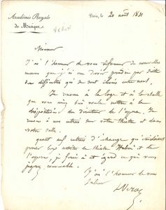 4 L.A.S. et 4 L.S., Paris 1831-1835, à Édouard Robert, directeur du Théâtre Italien ; 7 pages et demie in-4 ou in-8, en-têtes Académie Royale de Musique (on joint la minute d’une réponse). Le 20 août 1831, Véron renonce à la loge et à la stalle mise à la disposition du directeur de l’Opéra, ainsi qu’à ses entrées au Théâtre-Italien. « Quant aux entrées d’échange qui existaient pour les artistes [...] je ferai à cet égard ce que vous jugerez convenable »... Le surlendemain, il demande une liste des artistes pour lesquels Robert réclame, et le 23, il déclare qu’« à dater de ce jour les entrées d’échange demeurent supprimées entre les deux théâtres »... En février 1832 cependant, il concède des billets de bals masqués, sur demande préalable, et le ton se fait plus cordial : remerciements de son obligeance en juin, puis offre de places à La Tentation pour Robert ou Severini « ou les vôtres » (2 juillet 1832)... Lettre d’affaires sur l’arriéré du « bail Mathieu » (10 septembre 1834), et envoi à son « cher collègue » d’un billet de Cavé, reçu par erreur (14 avril 1835, billet a.s. du chef de la Division des Beaux-arts joint).