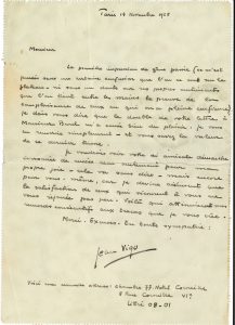 L.A.S., Paris 14 novembre 1928, à Claude Autant-Lara ; 1 page in-8, adresse au verso (fente réparée au scotch). Rare lettre de ses débuts. Le jeune homme explique sa gêne : « ce n’est jamais sans une certaine confusion que l’on se met sur le plateau – ni sans un doute sur ses propres sentiments que l’on tient entre les mains la preuve de la complaisance de ceux en qui on a pleine confiance ». Il remercie vivement Autant-Lara de sa lettre de recommandation auprès de M. Burel ; il espère voir sa démarche couronnée de succès. [Le chef opérateur Léonce-Henri Burel engagera en effet Vigo comme 4ème assistant opérateur aux Studios de la Victorine à Nice, et le fera ainsi entrer dans le monde du cinéma].