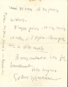 4 pages in-4 à sa devise Per non dormire, enveloppe (au crayon). « Madame Zeppilli [Alice Zeppilli (1885-1954) soprano italienne] a eu la grande bonté de venir consoler la tristesse de mes trop longues journées par la fraîcheur exquise de sa voix. Elle m’a chanté des airs du divin Mozart et ses vieilles chansons italiennes avec une grâce spontanée et un style parfait. Elle part pour Paris. Mon cœur la suit. Mon amour de la France, que vous connaissiez, est devenu plus haut encore »… Il a reçu la visite du commandant Geuss, et ils ont parlé de lui, « et des jours lointains. J’espère guérir, et vous revoir, et rentrer à l’Opéra-Comique avec la Ville morte »… On joint une L.A.S. de Léon Kochnitzky, « chef du Bureau des Relations extérieures » de Fiume, à M. Godchaux, Fiume 11 juillet 1920, évoquant les « heures inoubliables » aux côtés de Gabriele d’Annunzio, et sa consigne très sévère de ne jamais lui apporter de livres à dédicacer (2 p. in-4, en-tête, fentes).