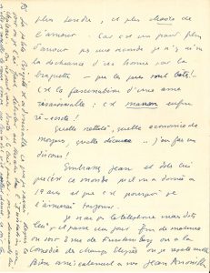 2 pages in-4. À propos du film d’Autant-Lara En cas de malheur, avec Jean Gabin et Brigitte Bardot. « Je veux vous dire que vous avez fait fort tous les deux, tous les trois, un très grand film. Un des plus beaux, un des plus purs et un des plus durs que j’ai vu. J’en sors gonflé et heureux : je venais de me taper l’Otage dans l’après-midi et ces deux choses sans point communs se sont fondues dans une même beauté me redonnant une redoutable envie d’écrire ! […] je n’ai pas vu depuis longtemps une peinture plus virile, plus tendre et plus chaste de l’amour. Car c’est un grand film d’amour pas une seconde je n’y ai vu la déchéance d’un homme par la braguette »… Il le charge d’embrasser Gabin et de lui demander de venir le voir à la Comédie des Champs-Élysées où il répète. Il ajoute : « La petite Brigitte est admirable, ce que je sais depuis le soir où je l’ai fait débuter au théâtre dans l’Invitation au château. On ne peut sans doute pas lui parler, mais demandez-lui si elle se rappelle le vieux singe qui lui a dit qu’il portait chance, ce soir-là »…