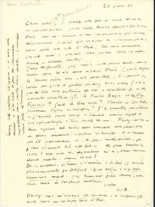 2 pages et quart in-8. 26 juin 1915, [à Mme Jeanne Charrot, marraine de guerre] : « Mon régiment et même mon escouade ont passé par de durs moments : ce secteur est terrible. Je n’aurais pas été brancardier et, en plus, indisponible, que j’étais sûrement tué cette fois-ci. À quoi tiennent les choses ? Ma crise de dysenterie m’a, sans aucun doute possible, sauvé la vie ! »… 31 octobre 1916, à son cher Bouvaist. Il se souvient fort bien de son condisciple de Rollin, maintenant maréchal des logis. « Je te remercie de ce que tu me dis sur Le Feu où j’ai pris à tâche de montrer la vraie et dramatique grandeur du soldat. J’ai fait assez longtemps la guerre dans les tranchées de l’Aisne et de l’Artois… Maintenant je suis en traitement pour les suites d’une dysenterie acquise sur le front. Ensuite, je ne sais pas ! »…