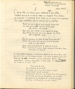 Manuscrit autographe signé, Métamorphoses du romantisme, 10 mai 1928, avec L.A.S. d’envoi à Albert S. Henraux, Paris 24 décembre 1929 ; cahier petit in-4 de 24 feuillets à couverture de papier bleu avec étiquette autographe, et 1 page in-4 à son chiffre, enveloppe, le tout monté sur onglets, rel. maroquin noir, triple filet sur les plats et contreplats, dos titré au chiffre A.S.H., étui (Le Douarin). Article pour les Cahiers de la quinzaine (19e série, 2e cahier, 1928 [31 janvier 1929]). Le manuscrit, écrit sur le recto des feuillets, avec de nombreuses ratures et corrections, et des additions portées en regard de 13 feuillets, est dédicacé en tête : « Pour Adal Henraux, ce manuscrit – en témoignage d’estime et d’amitié »… La lettre d’envoi précise : « Depuis 1925 et même auparavant j’ai montré que les grands courants romantiques se poursuivaient dans notre époque. Les rêves ont changé, les eaux et leurs couleurs sont à peu près les mêmes »… à la lumière des grands Romantiques et de quelques figures tutélaires (Rousseau, Napoléon), l’essai parle de Paul Morand, Jean de Tinan, Paul-Jean Toulet, Jean Pellerin, Marcel Achard, Jules Renard, Paul Bourget, et consacre des réflexions intéressantes à Jean Cocteau, qui débuta par des poésies « d’un romantisme traditionnelle », « avant qu’il se soit exposé aux vents encore mystérieux de son temps. Dès qu’il aura gagné le large il en reçoit les directions. Il sent, il voit, il comprend que le romantisme sentimental est tombé […] Mr Jean Cocteau possède davantage le don créateur que le don contemplateur. […] Il y a deux siècles il eût fait de la magie »…