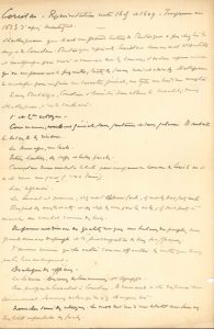 8 pages in-fol. et 5 pages et demie in-4 (un feuillet réparé). [Coriolan et Jules César]. Conférence sur deux grandes pièces romaines de Shakespeare. Le texte fut recueilli dans l’édition Crès de ses Œuvres complètes (t. VII, p. 105 sq., 1926). Après un bref exposé des intrigues respectives, Becque relève que Coriolan exalte le principe aristocratique, alors que Jules César anoblit le principe démocratique. « Pourquoi ? C’est que les idées ne comptent pas pour un auteur dramatique ; il n’y a que les caractères qui comptent. Les idées sont discutables et incertaines ; elles ont leurs rêves ; c’est leur application qui leur donne leur valeur ou leur non-valeur ; les caractères au contraire sont universels et éternels, et la fonction d’un auteur dramatique n’est pas de discuter des idées éphémères mais de nous peindre des caractères éternels »… – Manuscrit incomplet d’une conférence, annonçant son choix de deux pièces, mais ne traitant que de Coriolan. On joint une page de notes autogr., et le programme d’une Matinée extraordinaire. Sépulture et monument à Henry Becque, 31 mai 1904.