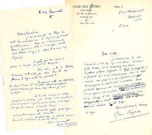 17 L.A.S. et 1 L.S., 1943-1948 et s.d., à Marc Barbezat ; 21 pages in-8 ou in-12, qqs en-têtes barrés Club des livres, qqs adresses (qqs lettres au crayon). Correspondance avec son éditeur, évoquant le « chef-d’œuvre des chefs-d’œuvre » en cours, une pièce de théâtre, des publications dans la revue L’Arbalète … Il demande une réponse à un poème de Joseph, et son opinion d’un écrit de Guillot de Rode… Demande d’exemplaires de sa Naissance de Rome. Projet de publier quelques fragments du Voyage en Cacagonie… Renvoi d’épreuves… Projet d’organiser des conférences, pour lesquelles on a le concours ou la sympathie d’Aragon, Paulhan, P. Emmanuel, R. Lalou, Eluard, Vercors, J. Prévert, etc. On joint 6 L.A.S. à Barbezat par divers ( ; et 6 L.A.S. de Madeleine Brisson.