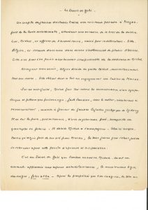 6 pages et quart in-4 ou in-8.10 mai 1918. Remerciement pour une lettre concernant Kœnigsmark… 22 février [1920], sur sa situation « au point de vue romans. Je viens de terminer Pour Don Carlos, que publie La Revue de Paris. Je suis en train de travailler à un nouveau roman […] retenu également pour La Revue de Paris »… 29 février, [à André Daven]. « Marcelle a écrit à Michèle Morgan pour lui dire qu’elle serait heureuse d’avoir sa photographie. Elle en a reçu une avec un mot adorable. […] c’est une bonne action qu’elle a fait là. Je voudrais bien savoir où en est l’histoire du film »… [1941 ?]. Résumé de l’intrigue du Désert de Gobi, mettant en scène Michel, Alzire et Sanders, sur toile de fond de Fouzan (Corée), Macao, et le désert de Gobi, en Mongolie. « Là vit un animal apparenté aux espèces antédiluviennes, le monstrueux tigre des neiges, felis alba. Après les péripéties que l’on imagine, la bête est capturée vivante. Mais Sanders trouve la mort au cours de l’opération. (Il convient de noter qu’il avait, quelques jours plus tôt, révélé à Michel, pour qui il s’était pris de l’affection la plus vive, qu’il le faisait rechercher.) Voilà Michel sur le chemin du retour. Propriétaire désormais du tigre blanc, il ramène sa captive à Sydney », etc. On joint un programme illustré de l’adaptation musicale de Kœnigsmark par J.E. Szyfer (Salle Marivaux, saison 1923-1924).