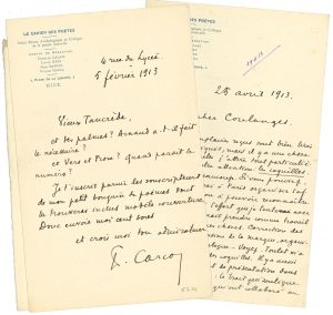 13 pages formats divers, qqs en-têtes Le Cahier des poètes, une adresse et une enveloppe. Nice 5 février 1913, à T. de Visan. « Et Vers et Prose ? Quand paraît le numéro ? Je t’inscris parmi les souscripteurs de mon petit bouquin de poèmes dont tu trouveras inclus modèle couverture » (maquette jointe de la couverture de Chansons aigres-douces)… 25 avril 1913, à Aurélien Coulanges. Instructions pour la publication et la publicité des Fantaisistes, écho de plaintes de coquilles de Paul-Jean Toulet, allusion aux Marches de Provence, promesse d’un article sur un peintre et d’un roman… Paris Dimanche [1919 ?]. Puy n’est pas à Paris. « Je lui écris et le presse de publier votre manuscrit car pour le débat avec les Guêpes il ne faut malheureusement pas compter sur L’Île. Déjà l’affaire Mandrin-Clouard paraissait exagérée à la Rédaction de L’Île. […]. J’étais à la conférence de Gide. J’ai vu Mithouard à qui j’ai parlé de vous, Gide, Chapon... etc. Une conférence très belle – Gide a dégagé fortement cette figure précise de volonté et de douceur qu’on devine à tout instant en lisant [Charles-Louis] Philippe. Hervé a superbement dit. Il a évoqué un Philippe un peu gros, robuste, sain, carré »… 6 octobre 1926, [à T. de Visan], remerciant pour l’article sur Le Roman de François Villon : « Tu es un frère et j’en suis très touché »… 7 janvier 1930, encore un magnifique article sur ses livres : « Tu es un frère… et fidèle, indulgent… un vrai de vrai »… [8 mars 1930]. Liste de tableaux confiés à la vente, avec précision des dimensions, des prix convenus et de la commission sur chacun : Femme à la guiche et Le Modèle de Derain, Montmartre d’Utrillo, Paysage du Midi de Segonzac… 17 mars 1930, à Théophile Briant, remerciant d’avoir fait rapporter « le tableau de Derain (Le Modèle) que je vous avais confié avec d’autres toiles »… Marseille 5 novembre 1932, à T. de Visan, pour souper après sa conférence : « je dois me mettre en smoking pour me présenter au public des Heures »… 9 janvier 1936 : « Si tu veux me voir, viens à 10h ½ aux Noctambules où je chante tous les soirs »… On joint divers documents.